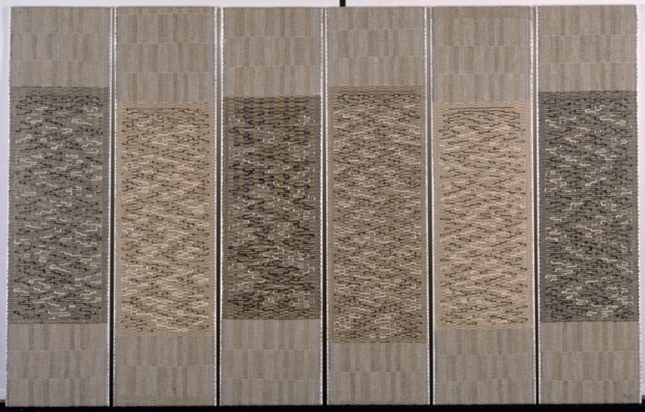 Albers’ pictorial weavings are markedly different to her linear pattern pieces; they show the breadth of her skill. While many of her works lend themselves to print, these weavings must be seen in real life to appreciate their minute detail and texture. Helical sections and bundles of knotted rope arranged in star formations lie amongst the multiplicity of layers, hung by single threads. Particularly striking is Six Prayers, a work that Albers was commissioned to create as a memorial to the six million Jewish people who died in the Holocaust. The six pieces that make up the artwork are akin to scrolls of text in appearance due to the winding horizontal pattern that lies atop the flat background. It is in fact not uncommon for Albers’ works to appear text-like. Following her travels to South America, where she saw ancient tapestries from the pre-Columbian era, she viewed weaving as a language of its own. In Six Prayers, she uses metallic yarn for the text-like pattern which shimmers against a dull and earthy background, symbolising light and hope in a terrible time.