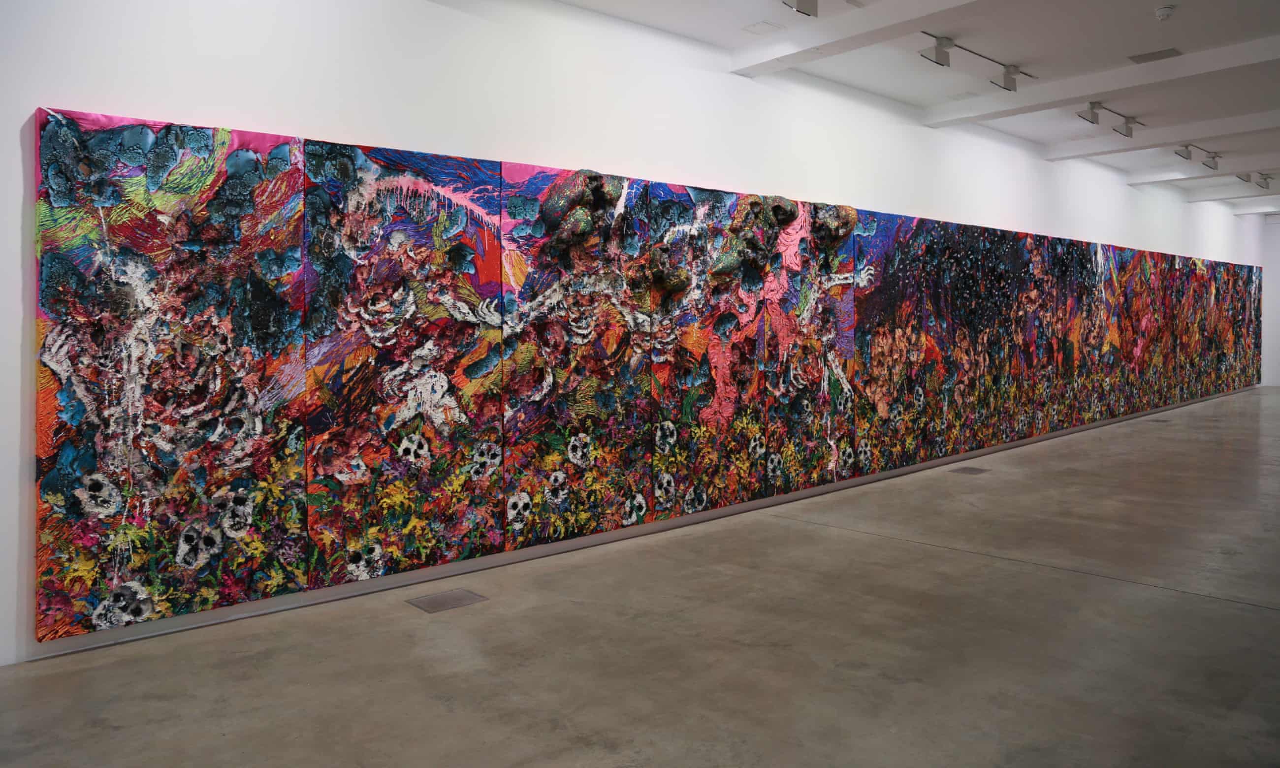 We Were Ugly conceives imagery of demons, skeletons, and the evil eye in 17 large-scale panels displayed in a contemporary space. The empty space of the gallery leaves plenty of room for the viewer to contemplate the niche-ness of Gyon’s art. The painting seems to exist somewhere between a two-dimensional and three-dimensional state. It retains sculptural elements while still utilising the flat canvas as its vehicle for expression. It renders neon pink, acid greens, nacreous textures, ripped textiles, and glittering surfaces in undulating waves. Gyon’s brushstrokes are rhythmic, incised with a knife to accentuate the hollows and bulges of the painted surface. The artwork itself is more like a relief work: impasto layers of paint and other less conventional materials are so thick, the bottom of the canvas no longer seems relevant. Much like a bed of coral, many textures are brightly coloured, piercing, and sharp. Others are soft and membranous in their bulbous protrusions. Cavities in the paint surface reveal caves of glowing gemstones crafted from glitter and seared oil paint. Variations in textures create an organic form, vaguely comparable to the body of Disney’s 1951 version of Absolem, the caterpillar from Alice in Wonderland. This organic aspect of the painting adds a sense of familiarity. It is a source of comprehension in a world made remarkably alien. Appropriating elements of Abstract Expressionism into the sweeping compositions of her paintings, We Were Ugly envisages a portrayal of Gyon’s internal mind in an organically iridescent, yet jarring manner.