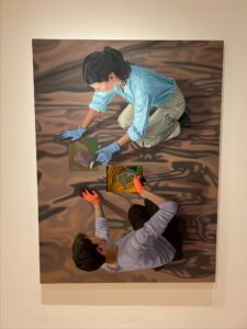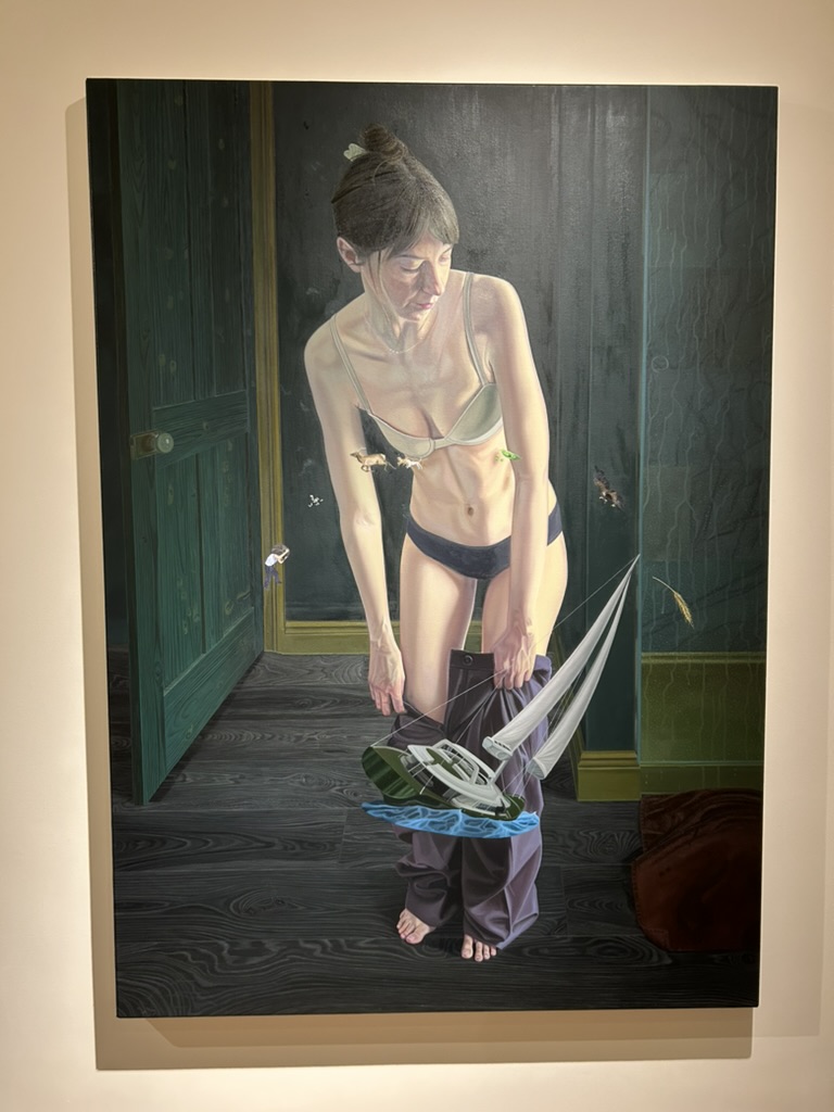 My personal favourite painting from the exhibition was a work by Tristan Pigott, made specifically for this exhibition titled God in the Machine. The work depicts a woman dressing herself. The delicate nature of the painting coupled with the intricate additional semicircle of figures across her body creates an intimate and gorgeous piece of work, layering the woman with trinket-esque overlays depicting animals, the large ship and the tiny sugar snap pea. This work held my gaze; his ability to manipulate the familiar into something quietly disarming left me questioning the reliability of what I thought I knew. Pigott’s ability to imbue such stillness with life and narrative is a rare gift.