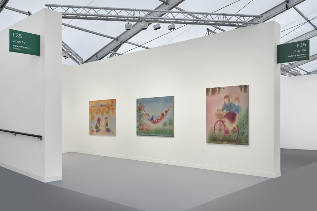 Weaving my way once more through a crowd of trench coats, Tabis, and Loewe bags, I move around the tent like a particle inside a glimmering, overstimulated organism. It is in the midst of trying to distract myself from my state of fatigue and dehydration that Gallery Vacancy’s booth glints in the distance like a mirage. Here, Brooklyn-based artist Xingzi Gu’s exhibition A Half-Dream is a quieter, more ethereal register—a pocket of condensation in the fair’s dry air. The hush that greets me isn’t silence exactly; it is a kind of density—the feeling of moisture on the lens, a soft-focus memory half-remembered. The gallery notes that Gu’s paintings are a mix of oil and acrylic, and they use a traditional Chinese brush-painting technique to depict the misty landscapes and figures that inhabit them.