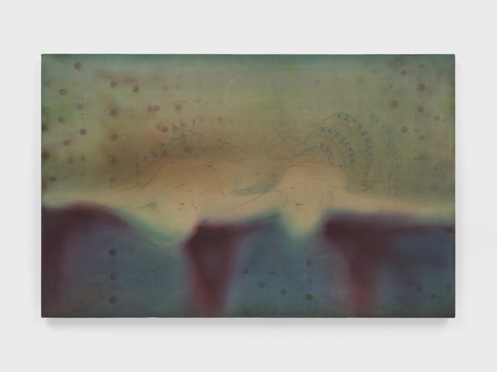 Gu’s work also lingers on adolescence and intimate moments that convey the tenderness of uncertainty and one’s loss of childish innocence. As my eyes glide over Landline, I am drawn to how their subjects are suspended between the clarity of youth and the opacity of adulthood. Here two figures lie side by side gazing at each other, naked from the waist up, tutus circling their hips. The painting feels cinematic in a quiet, elliptical way, like a film that begins halfway through a dream. Whilst scanning for edges and outlines that seem to keep dissolving, I realise that the experience of youth, memories, and dreams is much like standing before one of their canvases. To look at them is to feel time loosening its grip and slipping past my fingertips.